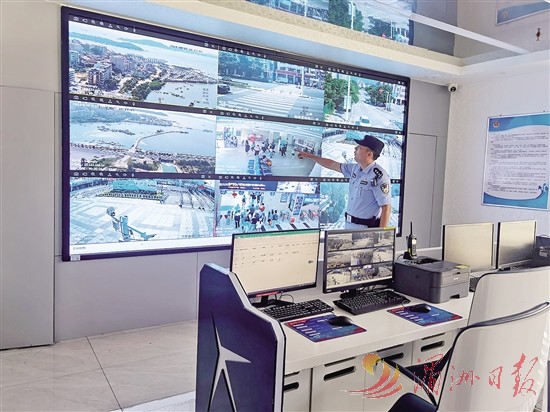在文甲码头警务站,记者看到墙上大屏九宫格,实时呈现海域、路面、候船大厅等地的动态。屏幕下方,值班人员操作电脑,密切关注。