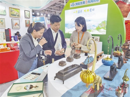 交易会上,莆田展馆以“妈祖故里 灵秀莆田”为主题,紧扣文旅深度融合高质量发展主线,组织旅游景区、星级饭店、旅行社、文创旅游企业等近20家单位参展。展品包括莆田木雕、石雕、油画、妈祖文创产品等500余件,促进旅游交易、展销合一(如图)。今年,莆田展馆特设省级非遗项目湄洲女头饰服饰展示区,工作人员梳起“帆船头”,穿上“大海衫”,为游客呈现精彩的非遗民俗秀,展现妈祖文化魅力。