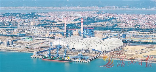 石门澳作业区11#泊位码头工程建设有1个10万吨级通用泊位及后方配套陆域设施,设计年通过能力466万吨,主要作业货种为煤炭、硫酸铵。记者在现场看到,该泊位配套2个目前省内跨度最大的干煤棚,与码头直线距离约200米。全封闭式皮带机将码头泊位、煤棚料仓、后方企业串在一起,形成完整的供应链条。