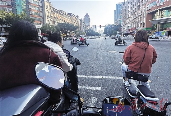 12月17日上午,荔城南大道与凤凰路交叉路口,2辆电摩骑行者与乘客均未佩戴头盔。