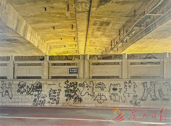 记者近日发现,市区岳公桥下滨溪步道两旁被乱涂乱画。