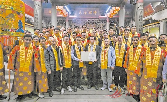 本报讯(全媒体记者 李霞 通讯员 周建国 文/图)日前,湄洲妈祖分灵广州南沙仪式在湄洲妈祖祖庙举行。湄洲妈祖祖庙董事会董事长林金赞陪同广州南沙天后文化学会创会会长陈镇洪、深圳弘善种福团长黄道辉等人,向妈祖依次行三献礼、割香鞠火礼。