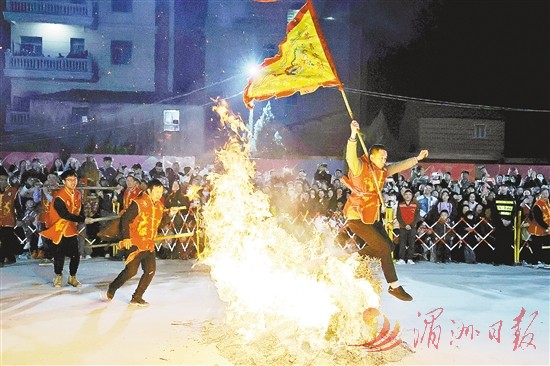 当晚,《狮鼓欢腾》表演拉开活动序幕。广场上,燃起熊熊烈焰,手抬棕轿的小伙子围绕火堆旋转,按“抬轿的走步”和“摆轿的跳步”规则,随着时紧时缓的锣鼓声,一次次高举轿子又落下,一次次穿火而过,一圈圈快跑疾跳(如图)。围观群众随着节奏呐喊助兴,表达祈福驱邪、兴旺发达的美好心愿。