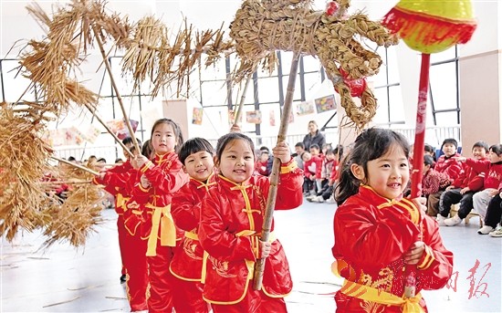 2月27日,浙江省台州市仙居县下各镇中心幼儿园的孩子在老师指导下进行“稻草龙”表演。“二月二,龙抬头”来临之际,各地举办丰富多彩的活动,喜迎传统节日。