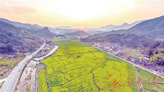 春日里,仙游万亩有机稻菜溪示范园的1500亩油菜花竞相开放,一片片金色“花海”绘就春日绚美画卷。图为3月10日,落日下的千亩油菜花田美景。