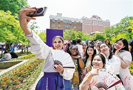 4月20日,中外青年在天津外国语大学第八届国际文化节上合影留念。当日是“国际中文日”,以“上合之约 天外同彩”为主题的天津外国语大学第八届国际文化节在天津外国语大学马场道校区开幕。
