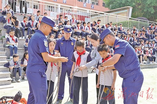 5月12日,北岸经开区减灾办联合区消防救援大队、卫健局、教育局,在北岸实验小学开展防灾减灾宣传活动。图为消防员正在开展“消防绳结教学”。陈琛 黄国民 摄
