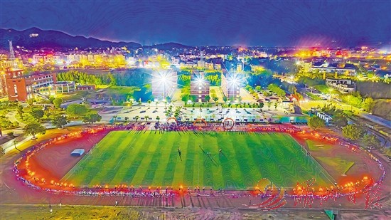 为激发毕业班学子决战中高考的勇气和信心,前不久,秀屿区实验中学举办火炬环城跑活动。图为师生在校园进行绕场仪式。