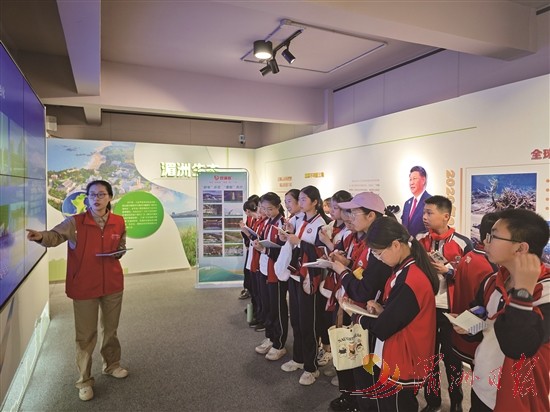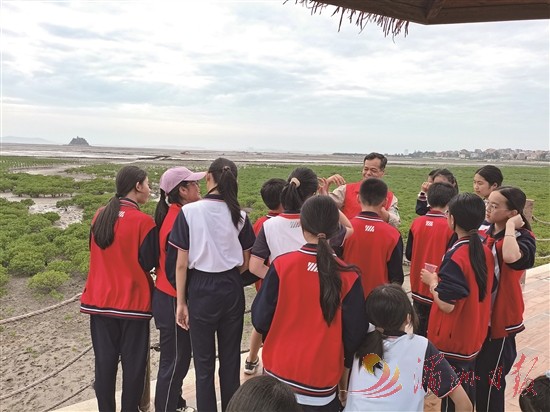活动当天,湄洲岛第一中心小学的学生们在国网福建电力“双满意”(莆田电力义修哥)共产党员服务队的带领下,走进港楼村红树林生态公园。大家参观了全市首座“近零碳”排放建筑,深入了解红树林种植成林、固碳等情况,沉浸式感受湄洲岛独特的生态之美。