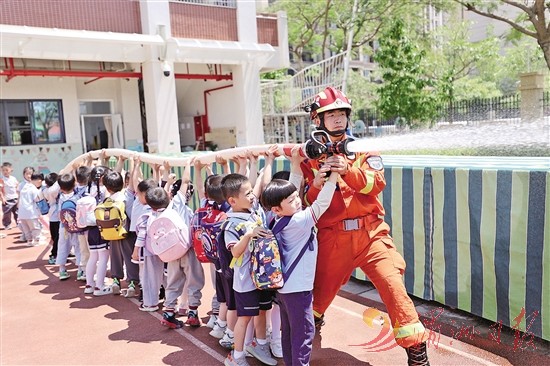 5月12日,在福建省厦门市翔安教育集团滨海幼儿园,翔安区消防救援大队消防员指导孩子们使用水枪出水“灭火”。当日是第17个全国防灾减灾日,各地展开学习应对灾难知识活动。