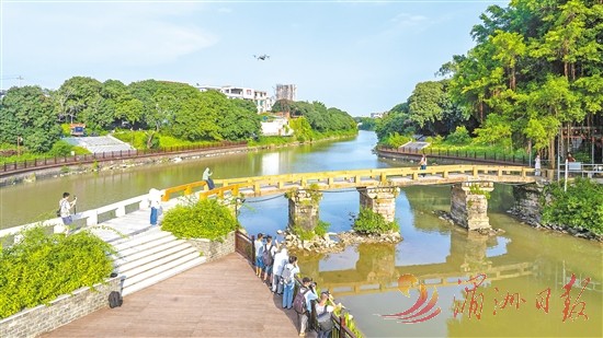 时值荔枝飘香季。新度镇下横山村的荔林水乡胜景吸引一批批远近游客纷至沓来。图为7月13日,游客在该村市级文物保护单位五府桥,用相机定格特色风情。全媒体记者 陈斌 摄