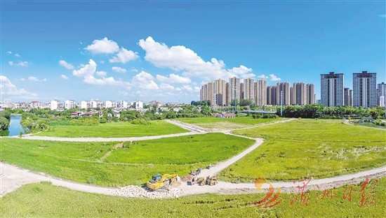 8月22日,记者在项目现场看到,这里被东郊河环绕,仅东南角有一座桥梁与陆地相连,形成湖心岛。挖掘机和铲车正在作业,工人们在初具雏形的田间道路上忙碌着。东侧河岸,已种植一大片三角梅和黄花风铃木。北侧河岸,一座提水泵站建起,一条长长的管道将河水引来,再通过纵横交错的沟渠,对稻田进行灌溉。