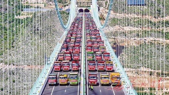 8月25日拍摄的贵州花江峡谷大桥荷载试验现场。8月25日,在建世界第一高桥——贵州花江峡谷大桥荷载试验顺利完成,通车在即。在静力荷载试验过程中,96辆总重达3300吨的重型大货车分批驶上桥面,对大桥进行了一次全面而严格的“体能测验”。荷载试验顺利完成,标志着大桥通过了通车前的“关键大考”,有望于9月下旬宣布通车。花江峡谷大桥于2022年1月开工建设,是贵州六枝至安龙高速公路的控制性工程,全长2890米,主桥跨径1420米,桥面到水面高度625米。花江峡谷大桥建成后,主桥跨径将居山区桥梁跨径世界第一、桥梁高度将居世界第一。新华社记者 陶亮 摄