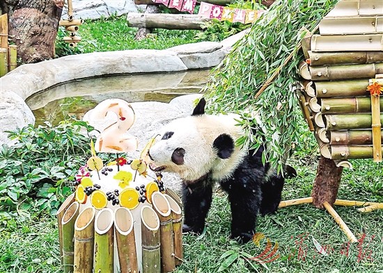 8月24日,大熊猫“喀秋莎”在俄罗斯莫斯科动物园享用“生日蛋糕”。新华社记者 张超群 摄