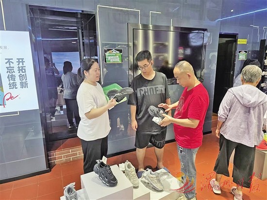 8月23日晚上8时,兴化府历史文化街区,“莆田鞋”官方旗舰店人流如织。作为“莆田鞋”集体商标授权产品的线下展销平台,货架上近百款设计新颖、色彩鲜明的运动鞋整齐陈列,吸引不少顾客俯身试穿。来自南昌的游客朱望琪拿起一双儿童运动鞋反复揉捏鞋底:“这鞋底特别软,款式也潮,我打算给孙子买上两双。”