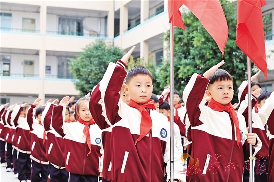 10月13日,在河南省焦作市温县第三实验小学,新入队队员在敬队礼。10月13日是中国少年先锋队建队76周年纪念日。