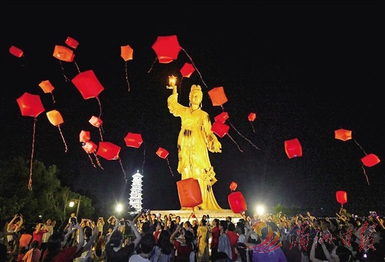 本报讯 (全媒体记者 吴琪娜 通讯员 程黎婷 周建国 文/图)10月6日是中秋佳节,湄洲妈祖祖庙天妃故里遗址公园以妈祖文化为核心载体,通过平安塔灯光秀表演、沉浸式中秋夜游、祈福放灯等环节,将中秋团圆氛围巧妙串联,让游客在兼具视觉美感与文化深度的沉浸式夜游活动中感受妈祖文化的魅力。