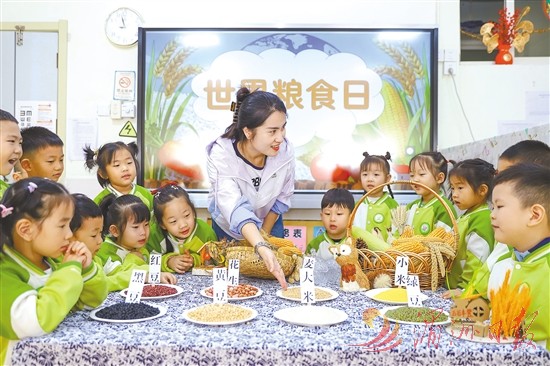 10月14日,在青岛市李沧区实验幼儿园,老师带领小朋友辨识粮食。临近世界粮食日,各地开展世界粮食日主题活动。