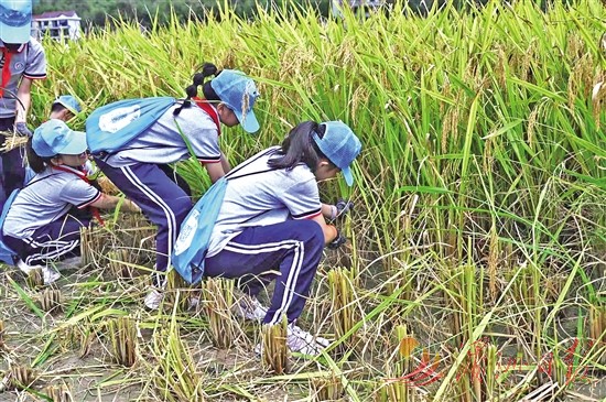 在菜溪乡象星村,市农业农村局高级农艺师原瑞芬为学生带来了“丰收节里话粮安,守护红线保仓廪”主题讲解。学生们近距离观察田园面貌,探究生态种植方法等。在钟山镇劳动实践教育基地,学生们体验割稻、脱粒、晒谷等过程(如图)。师生们还前往省储备粮管理有限公司仙游直属库,参观大食物观生态园、浅圆仓、平房仓、粮食检测实验室等。
