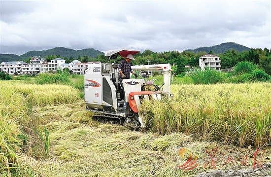 眼下,我市单季稻陆续进入成熟收获期。图为仙游县石苍乡单季水稻种植基地收割忙,收割机将成熟的稻秆卷入机器,脱粒、除秸秆、稻谷入袋一气呵成。