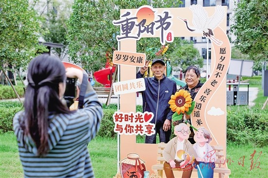 10月21日,青年志愿者给金婚老人拍合影。10月21日,浙江省湖州市长兴县泗安镇社会救助服务联合体组织青年志愿者们在双联村丰联佳苑小区开展迎重阳敬老助老活动,包括义诊、给老人拍合影、教老人做手工、给老人过集体生日等。青年志愿者们通过志愿服务,弘扬尊老敬老传统美德,传递温暖。新华社记者 徐昱 摄