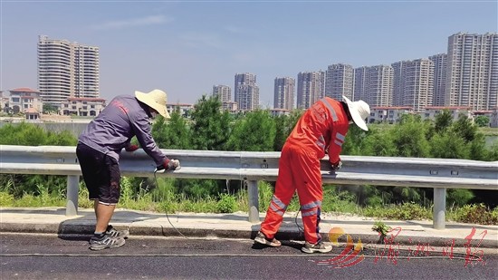 本报讯 连日来,在G228线湄洲山柄闸门二桥,工人们手持角磨机,细致地清除桥梁栏杆上的锈迹,为护栏重新涂刷纳米瓷化涂料做准备。