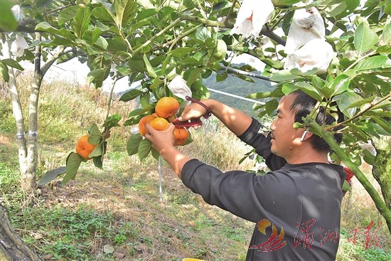 昨日,笔者走进位于钟山镇麦斜村的好柿多农场,但见漫山遍野的杮子树枝头,被一个个沉甸甸的套袋甜柿压弯,轻手剥开保护纸袋,露出橙红光滑的扁圆形果实。果农们正有条不紊地忙着采摘、分拣、包装、过秤、装车,无不干得热火朝天。