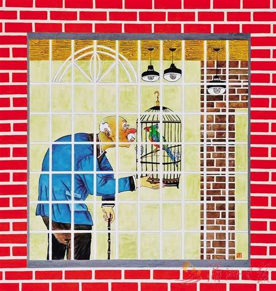 《笼中对》以敏锐的视角选题,独特的漫画构思、精到的艺术技巧,高度凝练地展现了当前进入老年社会,如何“关爱老人”这一严肃的社会问题。精美的工笔画面上,透过高档的窗户,一个老人面对笼中的鸟儿。漫画构思奇巧,寓意深刻;人鸟各囚“笼”中,同病相怜。作品突出主题,荒唐滑稽,含蓄幽默。人鸟同在“笼”中,妙在一个“对”字,真是点睛之笔。人鸟虽无共同的“语言”对话,但有共“笼”的无奈对看,相对虽无言,却无声胜有声。反映了当今老年人需要物质生活,更需要精神生活的呐喊。