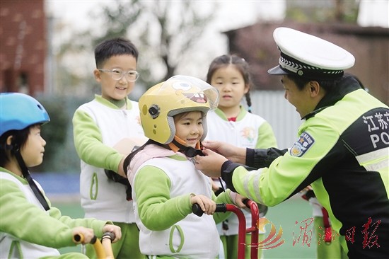 12月2日,在江苏扬州大学附属西郡幼儿园,交警为小朋友讲解如何正确佩戴头盔安全出行。12月2日是“全国交通安全日”。连日来,各地举办各类交通安全主题活动。新华社 发