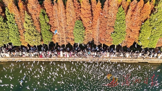 日前,游客在滇池畔的海洪湿地公园喂红嘴鸥。近年来,昆明滇池水域的水生态、水环境持续改善,重现“景美、鸥飞、鱼跃”的生动画卷,吸引众多游客前来打卡。