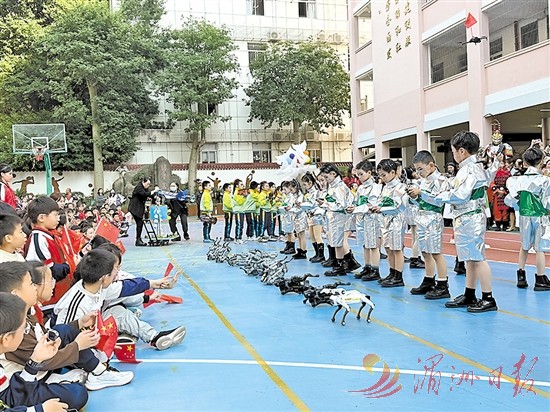 12月17日,荔城区梅峰小学第二届科博会暨跨学科主题学习成果展示活动开幕。图为学生们在操场上观看机器狗欢乐舞蹈节目。 陈惠炀 摄
