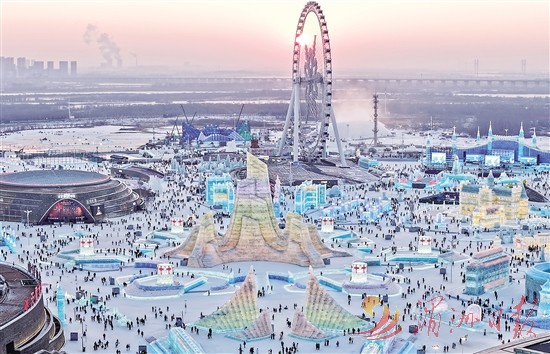 这是12月17日拍摄的哈尔滨冰雪大世界园区内的冰建景观。12月17日上午10时,第二十七届哈尔滨冰雪大世界正式开园迎客。园区占地面积达120万平方米,总用冰用雪量突破40万立方米,以历届之最的规模,打造一座冰天雪地的“童话世界”。新华社记者 王松 摄