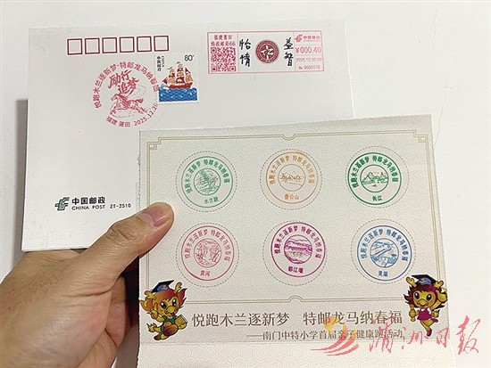 当天,南门中特小学在福建省青少年集邮活动示范基地木兰溪绿道举办首届亲子健康跑活动。莆田邮政为此发行编号ZT2510的纪念信卡1套1枚,并配套启用8种纪念戳章,包括纪念邮戳、邮资机宣传戳各一种,以及1组6枚主题打卡章(如图)。纪念邮戳以“励行追梦 悦跑木兰逐新梦·特邮龙马纳春福”为主文案,衬以骏马奔腾图案;邮资机宣传戳则融合校标与“怡情 益智”字样(这四字寄语出自曾到访南门中特小学的国际集邮联合会评审会士林茂兴先生),戳上二维码还可一览该校“特邮趣”品牌的发展历程。打卡章系列选取壶公山、木兰陂、长江、黄河、都江堰、灵渠等标志性山水与水利工程,寓意贯通古今、泽被四方。
