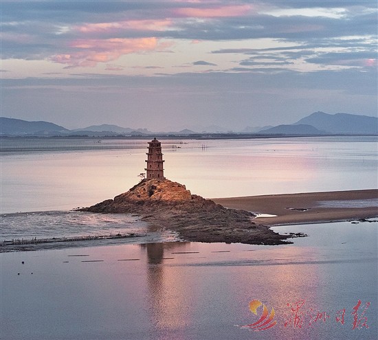 傍晚,蒲草漫过海中的孤岛与石塔。