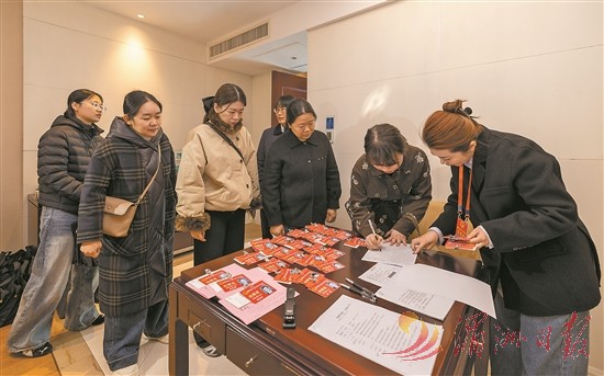市八届人大六次会议今日开幕。昨日上午,参会的市人大代表陆续报到。图为代表们领取会议证件。