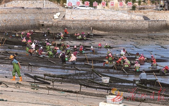 中国紫菜第一村蒋山村“头水”紫菜采收。