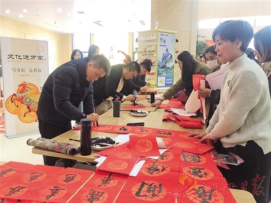 新春临近,湄洲日报社组织书法家创作马年主题春联,以笔墨传递温情,为楼宇共建职工送去满满祝福。图为书法家现场书写春联。全媒体记者 杨洲 摄
