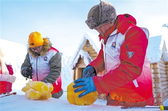 1月28日,第二十七届哈尔滨冰雪大世界的冰雕师使用植物彩色冰进行雕刻创作,为冰雕艺术带来崭新的视觉体验。植物彩色冰以木粉、树叶、花草等为原料,从中分离出植物色素,经特殊工艺处理后再经冷冻加工制备而成,最终形成色彩斑斓的冰块。待来年春季冰雪消融后,彩色冰将自然降解。新华社 发