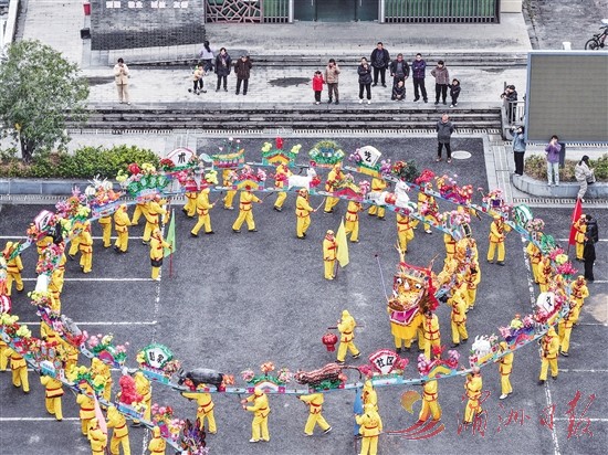 2月10日,诸暨市赵家镇赵家社区村民抬着板凳龙在镇综合文化站广场上舞动。2月10日,浙江省诸暨市赵家镇举行传统的板凳龙巡游迎新春民俗活动,80余块饰有十二生肖、戏曲人物的板凳花灯串联成100多米的板凳长龙,在乡镇街道和广场巡游,为即将到来的新春佳节增添了浓郁的传统韵味与热闹氛围。新华社 发
