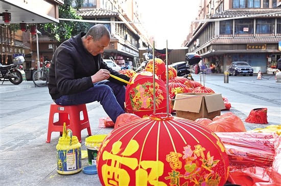马年春节临近,在荔城区十字街,老手艺人正在赶制新春灯笼。红彤彤的灯笼上绘有“福”字与吉祥纹样,匠人的专注让传统年味在指尖绽放。