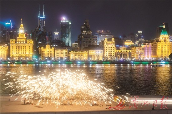近日拍摄的非遗“打铁花”表演。首届“浦东中国年味节”日前在上海市浦东新区黄浦江畔举行,非遗“打铁花”成为夜色中一道亮丽的风景线。