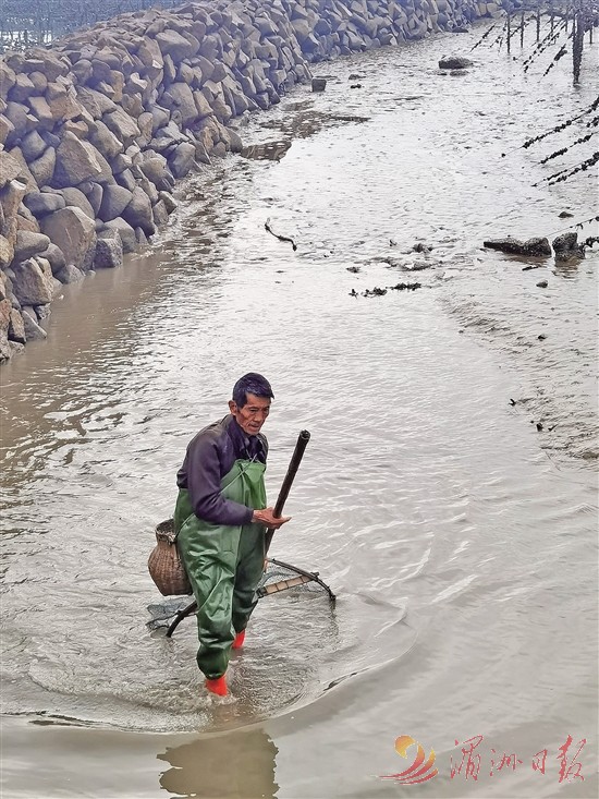 昨日清晨,秀屿区埭头镇田边村,69岁的吴文祥穿上连体的防水胶皮裤,腰系竹篓、扛起网兜,前往石沪捕鱼。