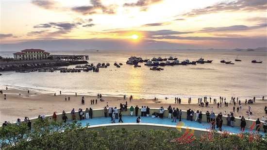 冬日的湄洲岛别有一番景致。图为近日,海内外游客在鹅尾海滩欣赏海岛日落美景。