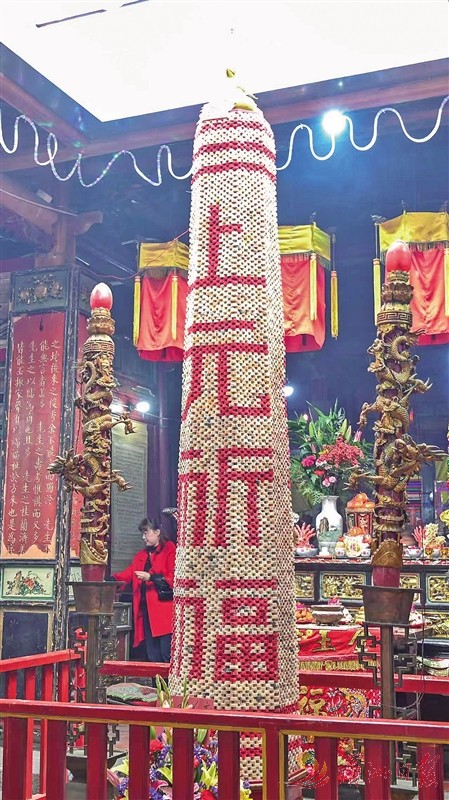 如今,延宁宫用甘蔗搭建“灯塔”这一民间手工艺术,依然在传承、延续。在延宁宫门口,有一副大红对联这样写道:“中华一绝,妈祖蔗塔,享文化遗产美誉;巧夺天工,天后橘塔,展民间艺术雄姿。”这条后联写到的“橘塔”,就是人们借助搭蔗塔的巧思,在另一边用柑橘堆叠成塔,互为对应,相映成趣,也凸显着搭蔗塔这一根深蒂固的文化内核,依然生生不息。