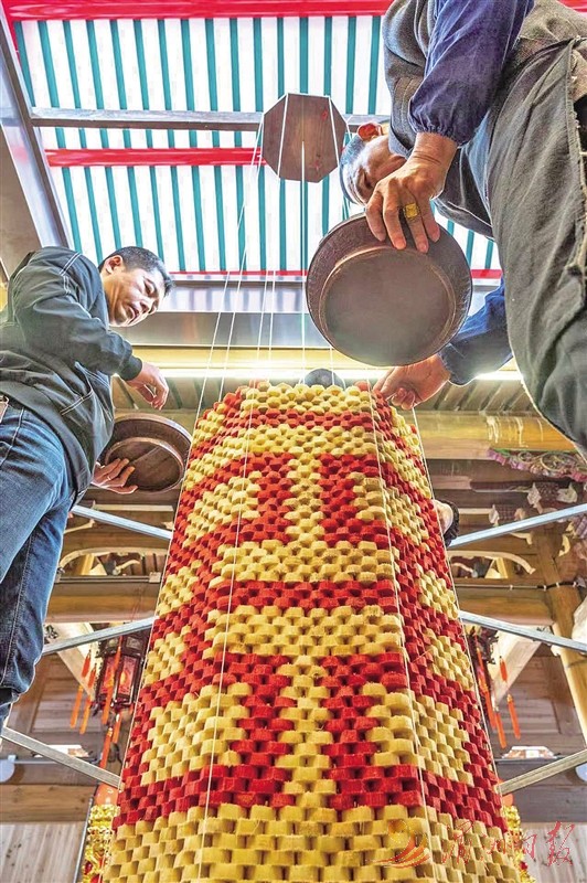 去年元宵节,我返乡时特意去往延宁宫观看蔗塔。我发现,经过近年来民间能工巧匠的不断创新,现在的蔗塔是利用延宁宫中的天井,置一木制的八卦形底盘,然后用新鲜的甘蔗片在底盘上垒叠。整座蔗塔需要150多公斤甘蔗,叠好的蔗塔呈八角形,上下共365层,高4.2米,前面仍嵌“上元祈福”四字,后面则嵌一“囍”字,里面放置着彩灯,使塔身透射出闪闪烁烁的七色光亮,分外迷人。据介绍,目前延宁小区只有5位老师傅会这项绝活。每年从农历正月十一早上开始,他们就日夜轮班叠蔗塔,帮工的也要三五人,一直垒搭到正月十四傍晚才完成。